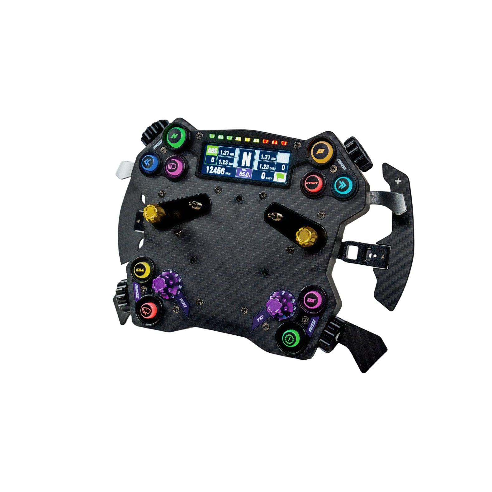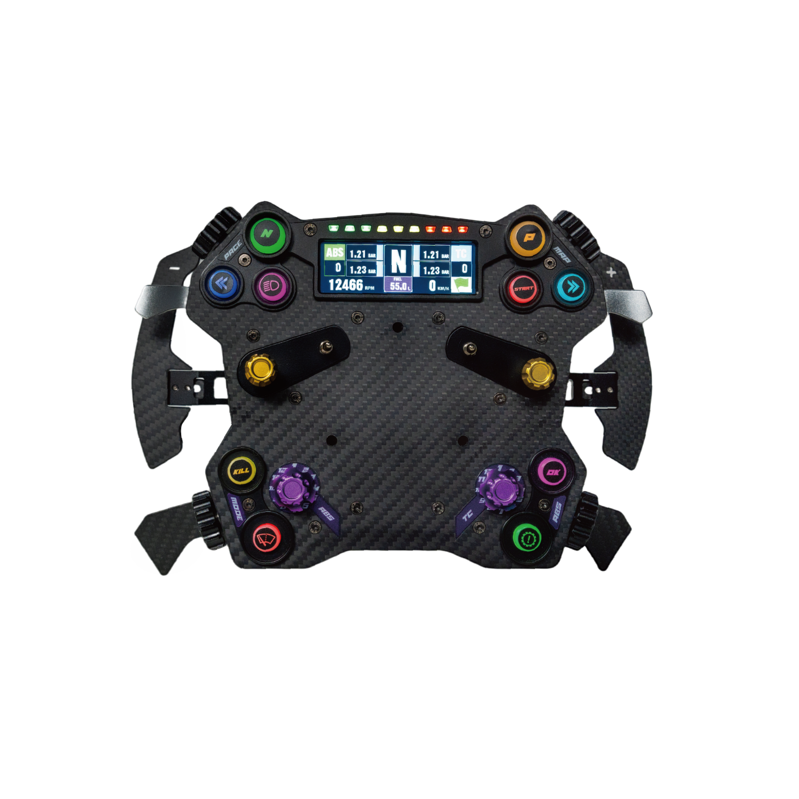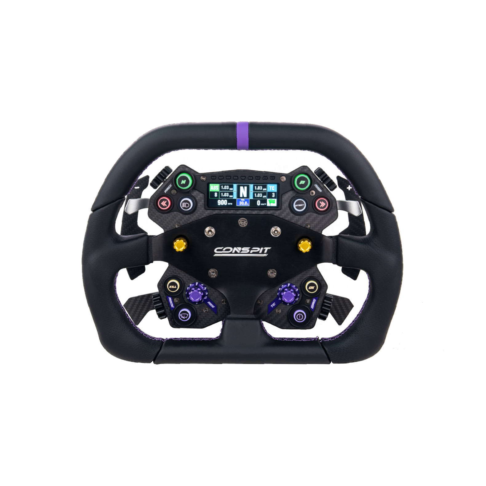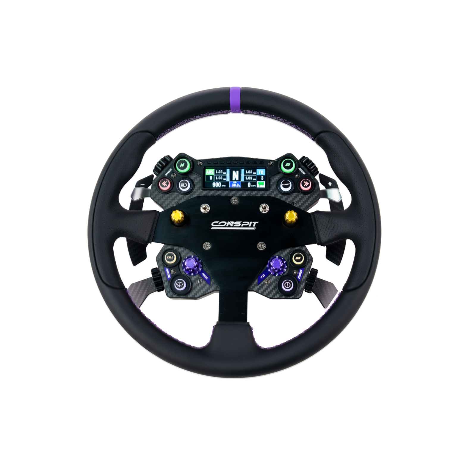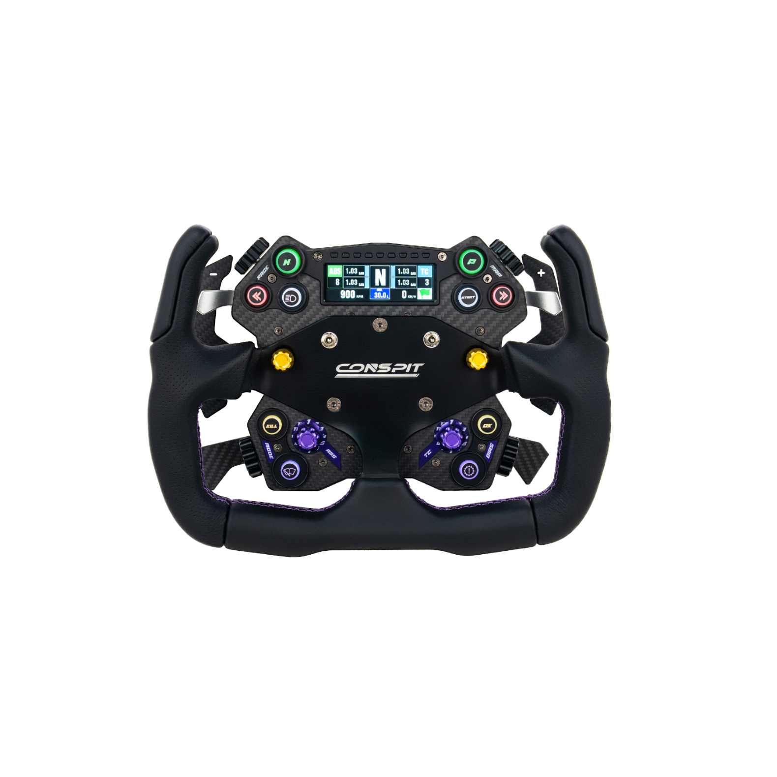 A gombok és azoknak a világításai SimHub-bal vezérelhető, de a kijelző csak a Conspit saját szoftveréből.